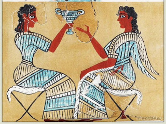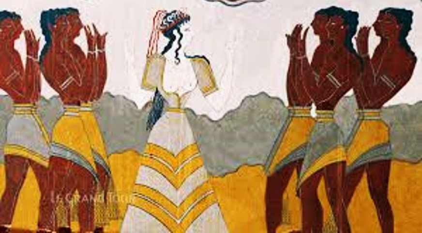 W rytualnej scenie na minojskim fresku, jaki mamy po prawej widzimy strukturę labrysu, który został ożywiony. Mężczyźni mają uniesione ręce w geście błogosławieństwa, jaki znamy z wielu figurek Bogini. Skierowani ku sobie nawzajem, całkowicie odsłonięci, jawni, otwarci, patrzą sobie odważnie w oczy. To zupełnie inny rodzaj odwagi i zupełnie inna energia niż ta, którą mają wojownicy. Piękny, męski etos: chronienia i wspierania życia. Tej, która rodzi wszelkie życie, a którą uosabia tu kapłanka.